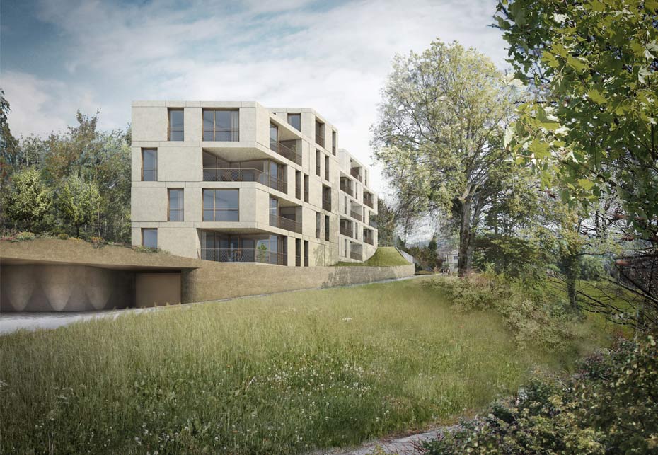 Wie ein Granitstein, zurecht gemeisselt mit klaren Flächen und ausgeprägten Kanten in einer saftiggrünen Bergwiese liegend, präsentiert sich das Wohnhaus Gütsch über dem Dorf Oberägeri. Durch seine Form schmiegt es sich wie selbstverständlich an das natürliche Terrain an. Das reduzierte, klar gegliederte Bauwerk nimmt Form und Lauf des natürlich gewachsenen Waldrands im Norden auf und erzeugt dadurch spannungsvolle Aussenbereiche. Die massive, langlebige Fassade unterstreicht dabei bewusst die Analogie des grob behauenen Steinblocks. Darin eingefügt sind zahlreiche grosszügige Öffnungen, welche den Bewohnern nicht nur den unverbaubaren Blick auf das Tal, den See und die Berge erschliessen, sondern zugleich auch für Lichtfülle in den Innenräumen sorgen. Die dezent platzierten Loggias schaffen einerseits Raum zum Erholen im Freien und bieten andererseits eine grosse Privatsphäre. Das Wohnhaus Gütsch ist vollständig nach MINERGIE® Standards gebaut. Damit ist sichergestellt, dass die benötigte Energie effizient und nachhaltig eingesetzt wird. Zudem wird seine mehrseitige Ausrichtung der Wohnungen erreicht.